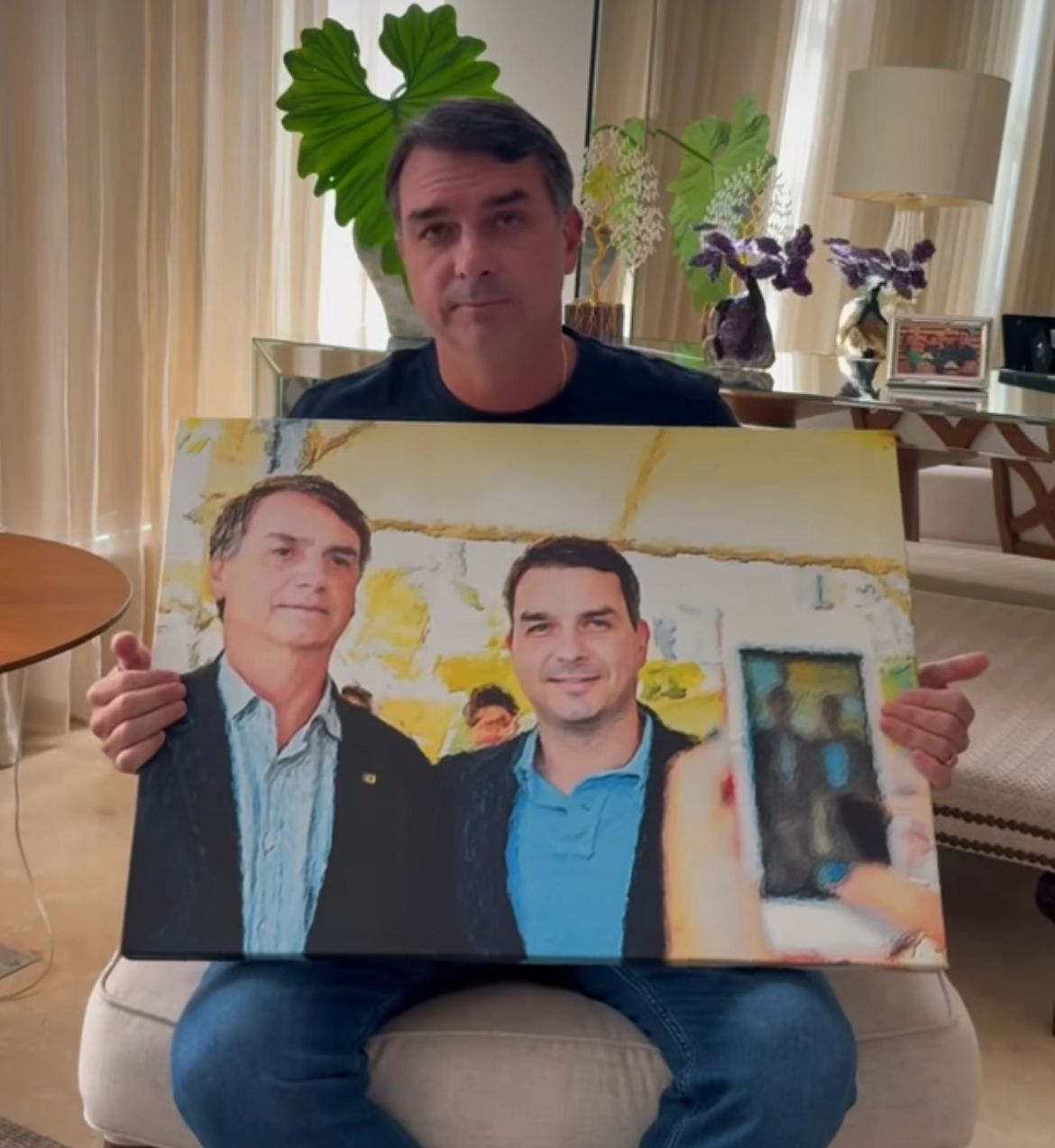 No vídeo endereçado ao pai, o senador também lamenta que o pai não possa ver o vídeo. Na gravação, aparece uma cadeira vazia com um quadro com a imagem de Flávio ao lado de Jair Bolsonaro. O senador dirige-se à cadeira, pega o quadro, e senta-se. Em seguida, endereça uma mensagem ao pai. O vídeo foi publicado por volta de 10h. Em seguida, Flávio foi até a casa onde o pai cumpre prisão domiciliar, em Brasília, para visitá-lo. E permanece no local até o momento. O Estadão confirmou que a ex-primeira-dama Michelle Bolsonaro e os filhos de Bolsonaro Jair Renan e Laura também estão na casa.