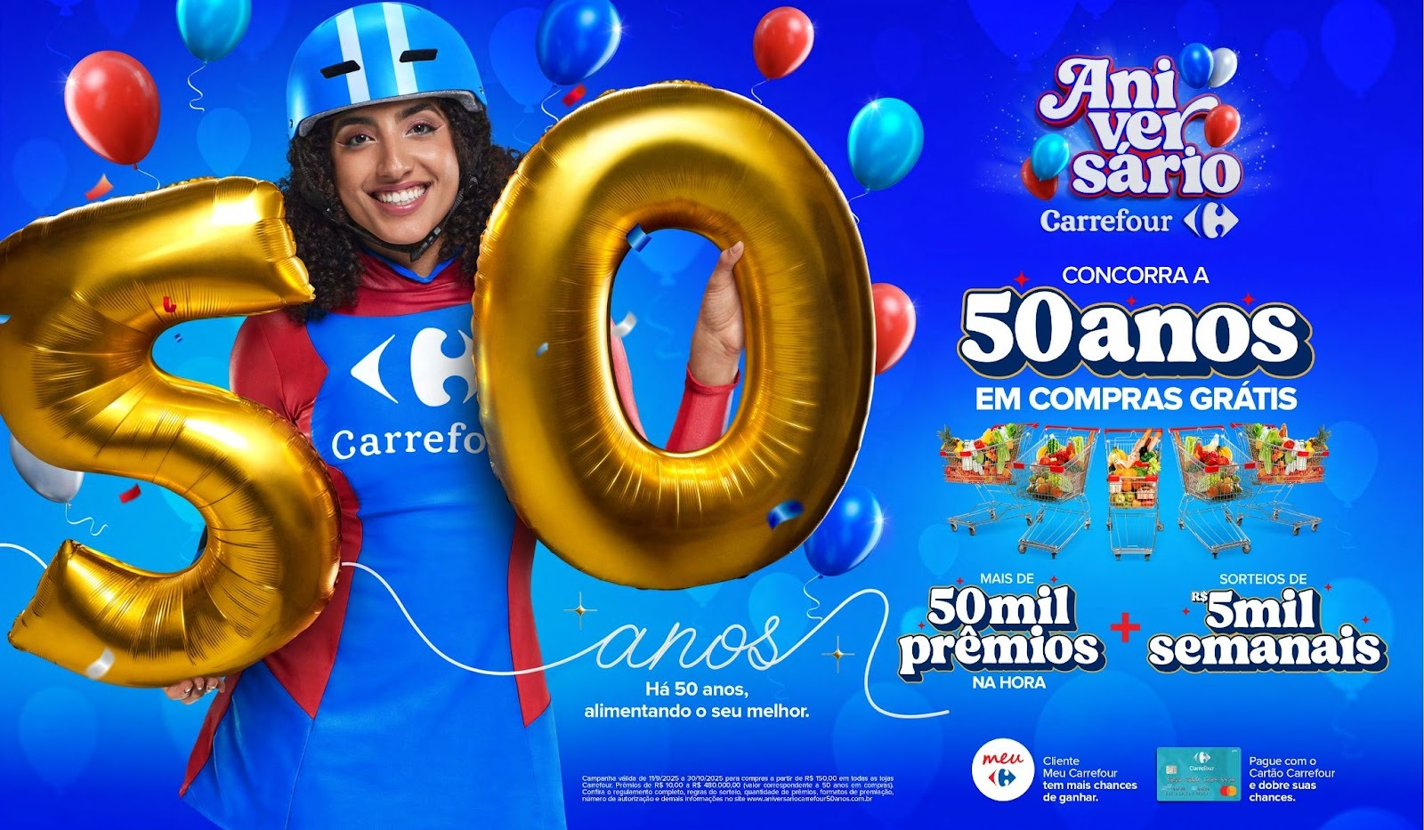 O Carrefour lança a promoção “50 Anos de Compras Grátis”, considerada a maior já realizada pela companhia no Brasil. A iniciativa integra a celebração dos 50 anos da marca no país e oferece prêmios inéditos, incluindo 50 anos em compras grátis, além de sorteios semanais de R$ 5 mil e mais de 50 mil prêmios instantâneos no caixa.