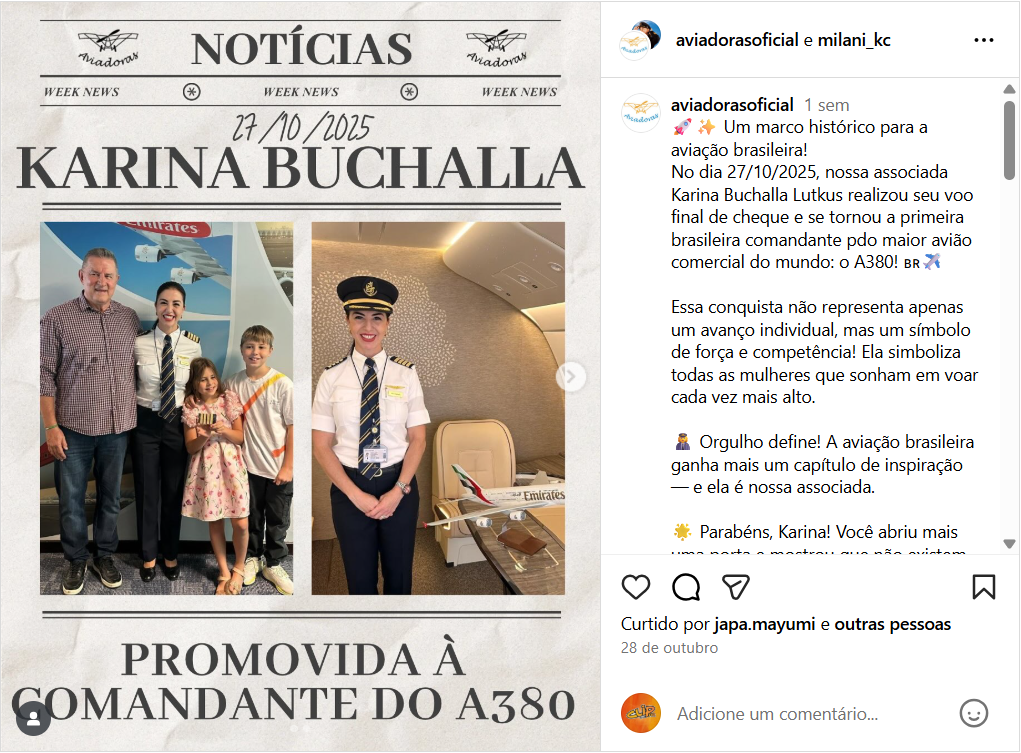 O feito também foi comemorado pela Airbus, fabricante do A380. “O maior avião de passageiros do mundo está em ótimas mãos! Parabéns à comandante Karina pela conquista e por inspirar novas gerações”, escreveu a empresa em uma publicação no Instagram.