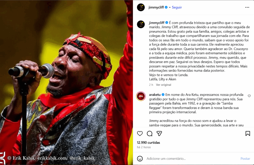 Morreu o cantor e compositor jamaicano Jimmy Cliff, um dos maiores nomes da história do reggae, aos 81 anos. A informação foi confirmada num texto publicado no perfil oficial do artista no Instagram, assinado por Latifa, sua esposa. Segundo o post, Cliff morreu após sofrer uma convulsão causada por um quadro de pneumonia.